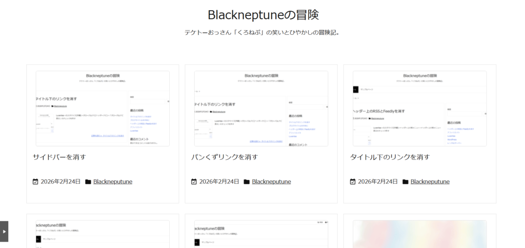 Luxeritas→カスタマイズ(外観)→グリッドレイアウト→「記事一覧の抜粋の文字数と色濃度」の「タイル型」を0に